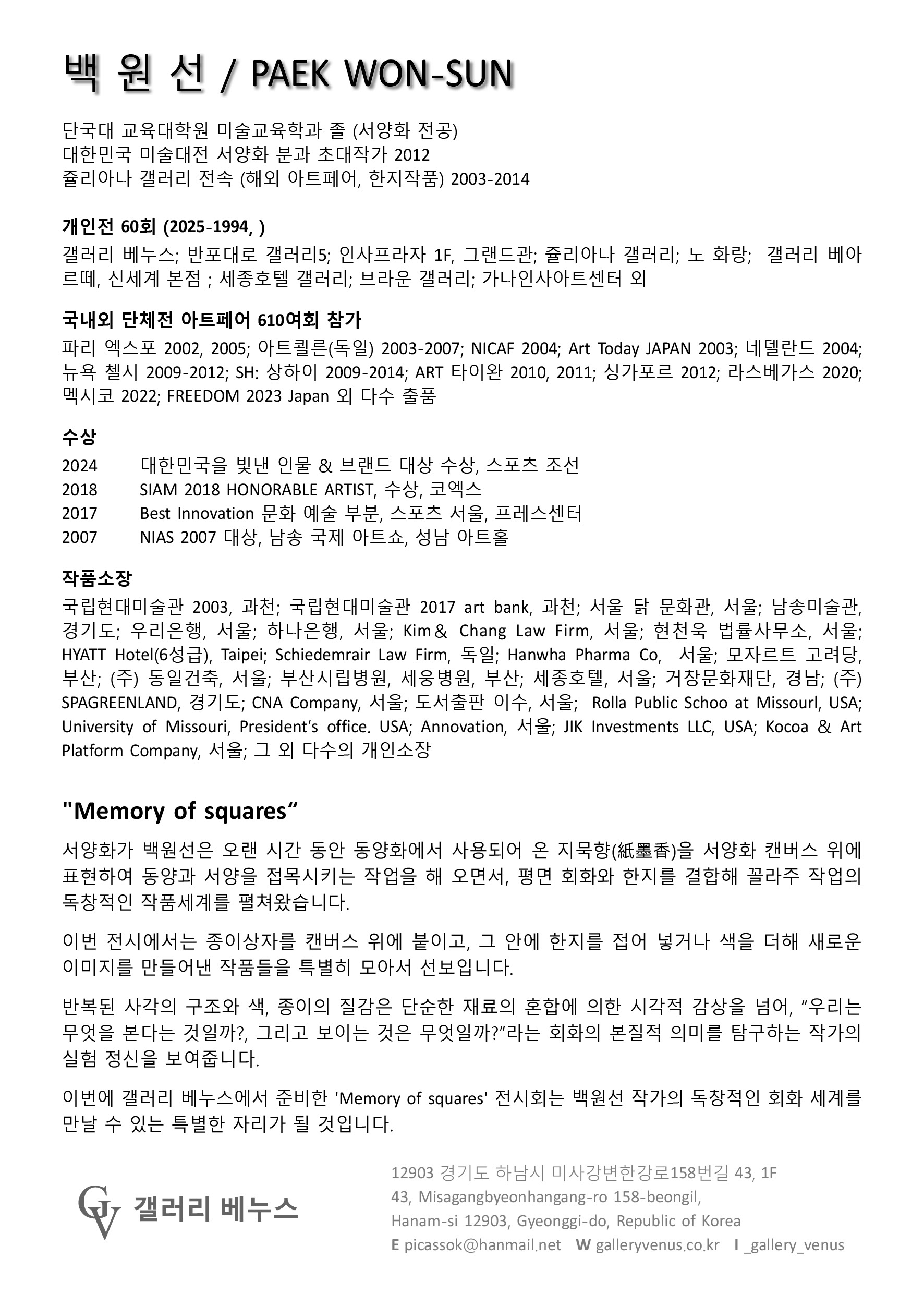 갤러리 베누스에서 준비한 이번 「Memory of squares」 전시는 백원선 작가가 오랜 시간에 걸쳐 축적해 온 조형 실험의 결정체라 할 수 있습니다. 동양과 서양의 조우, 평면과 입체의 결합, 반복된 사각의 구조 속에 담긴 무한한 변주와 사유를 직접 마주할 수 있는 특별한 자리로, 관람객들에게 회화의 또 다른 차원을 경험하게 할 것입니다.