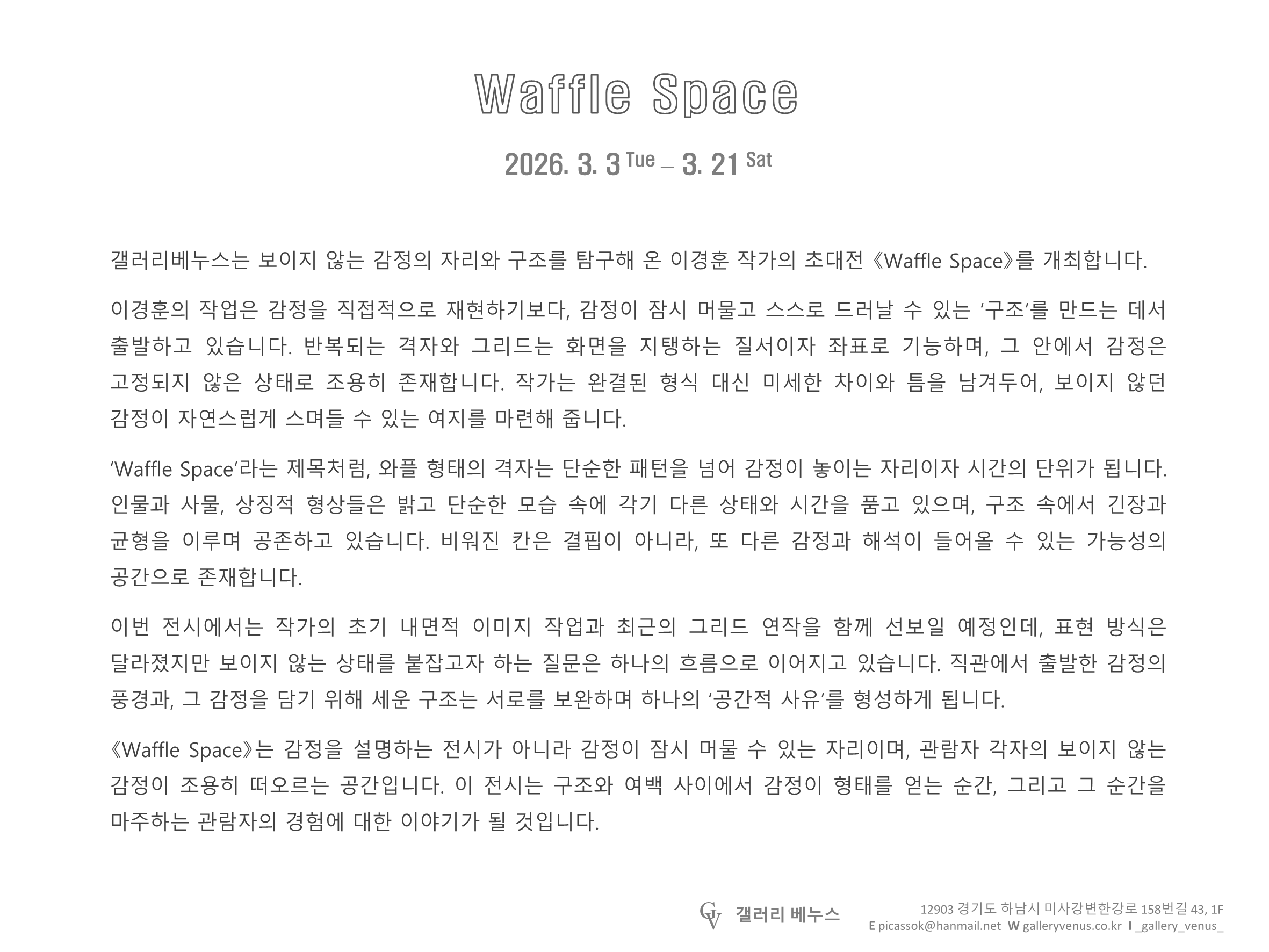 갤러리베누스는 보이지 않는 감정의 자리와 구조를 탐구해 온 이경훈 작가의 초대전 《Waffle Space》를 개최합니다.